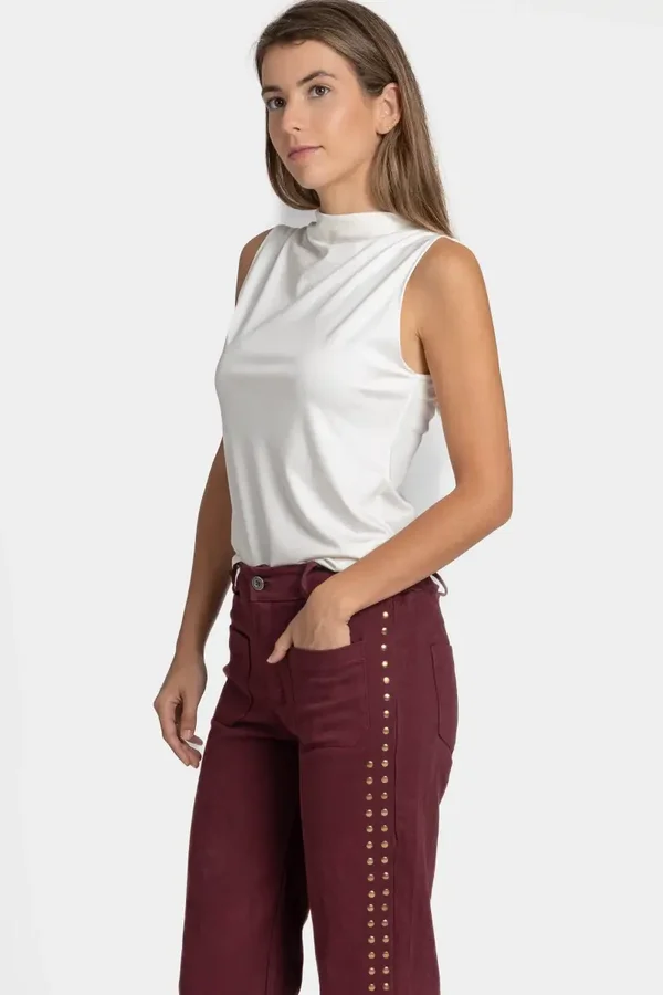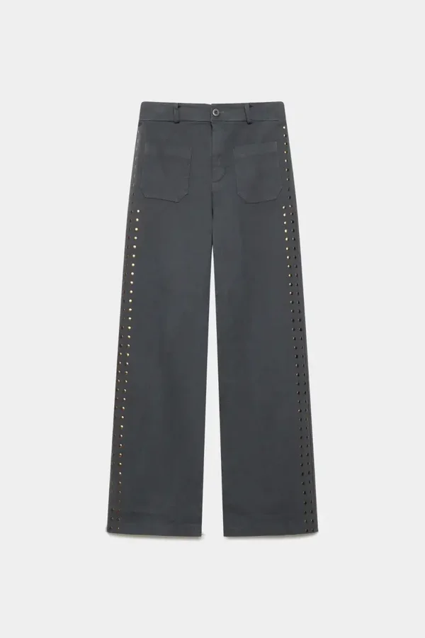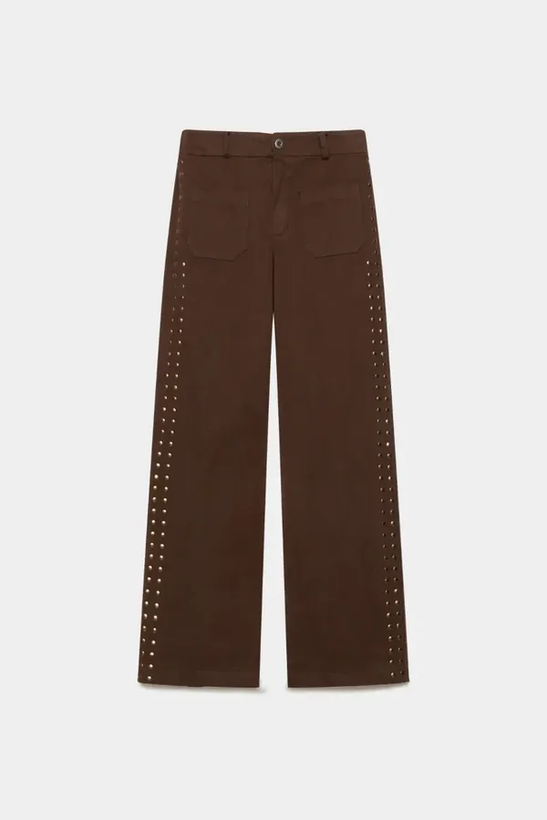 Tejido de algodón. Cintura media. Cuatro bolsillos. Cintura elástica. Diseño recto. Cierre cremallera y botón. Disponible en 4 colores.