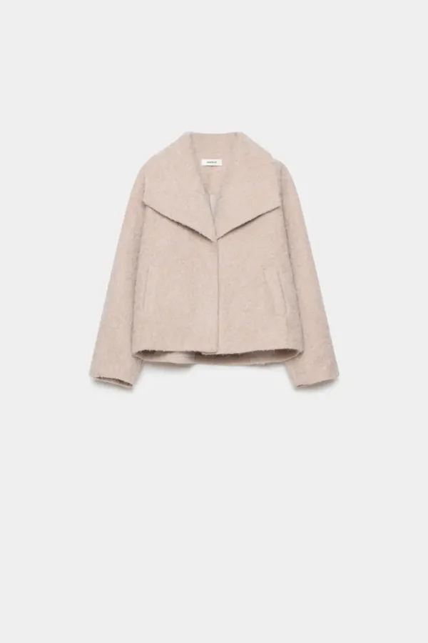 Tejido efecto pelo. Cuello solapa. Cierre de botón. Bolsillos laterales. Forrado. Diseño corto.