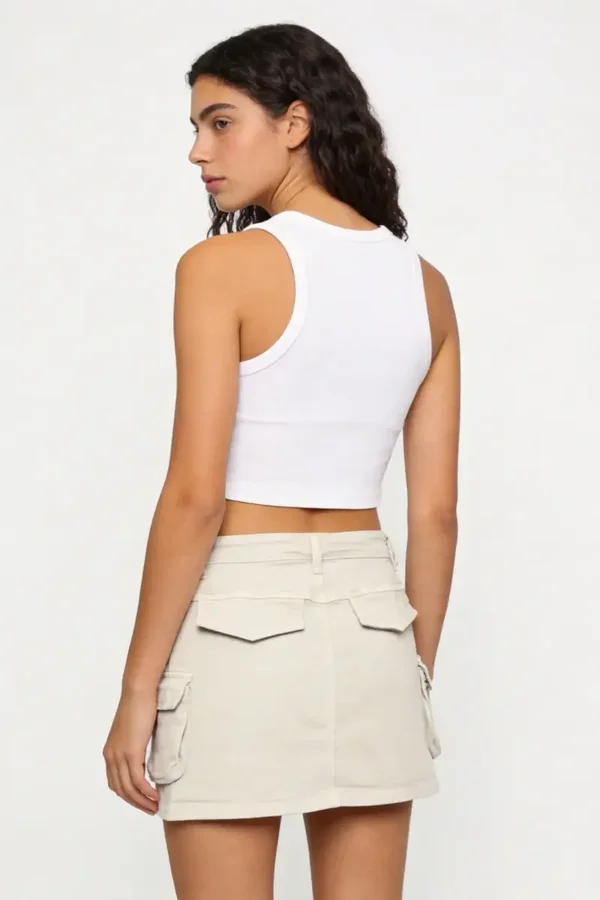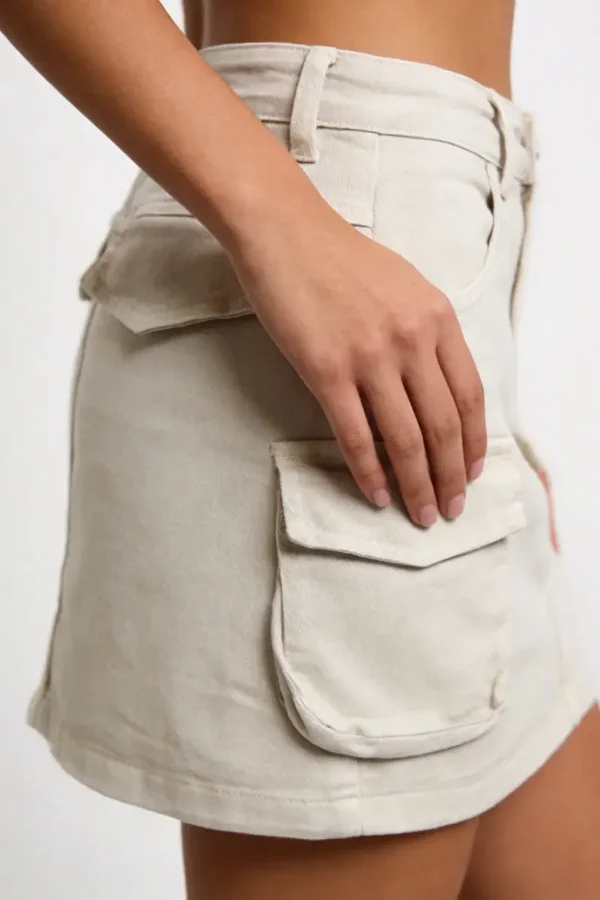 Tejido mezcla de algodón. Tiro medio. Diseño corto. Dos bolsillos. Dos solapas decorativas traseras. Dos bolsillos cargo. Cierre de cremallera y botón. Trabillas. Talla modelo: 36.