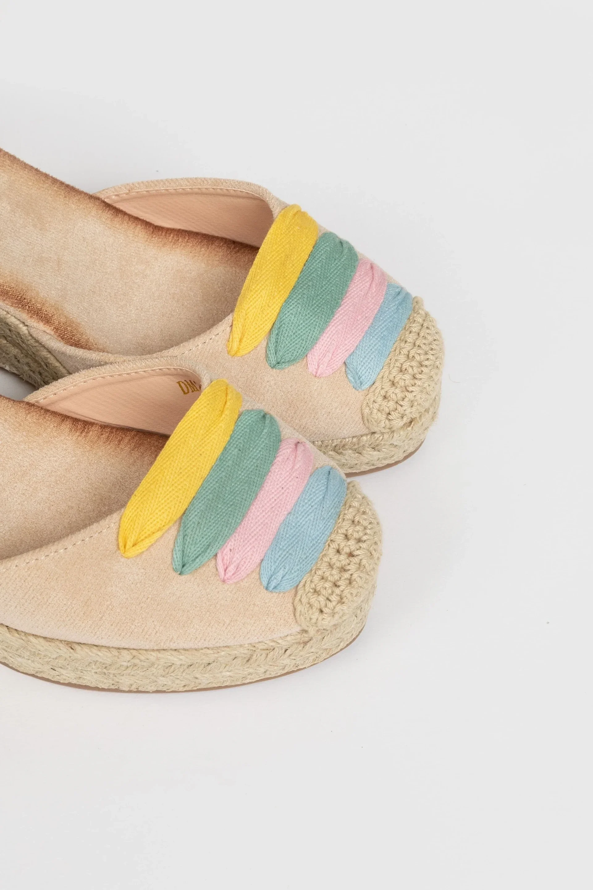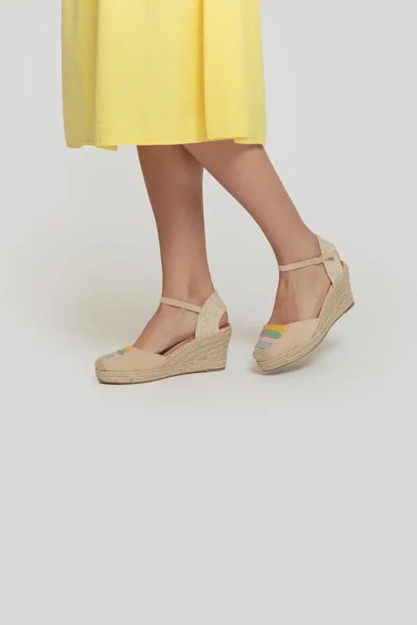 Alpargatas con cuña. Tejido lona. Diseño cordones. Punta redondeada. Cuña de esparto. Cierre de hebilla. Atada al tobillo. Suela de contacto antideslizante. Altura cuña: 8.0 cm.