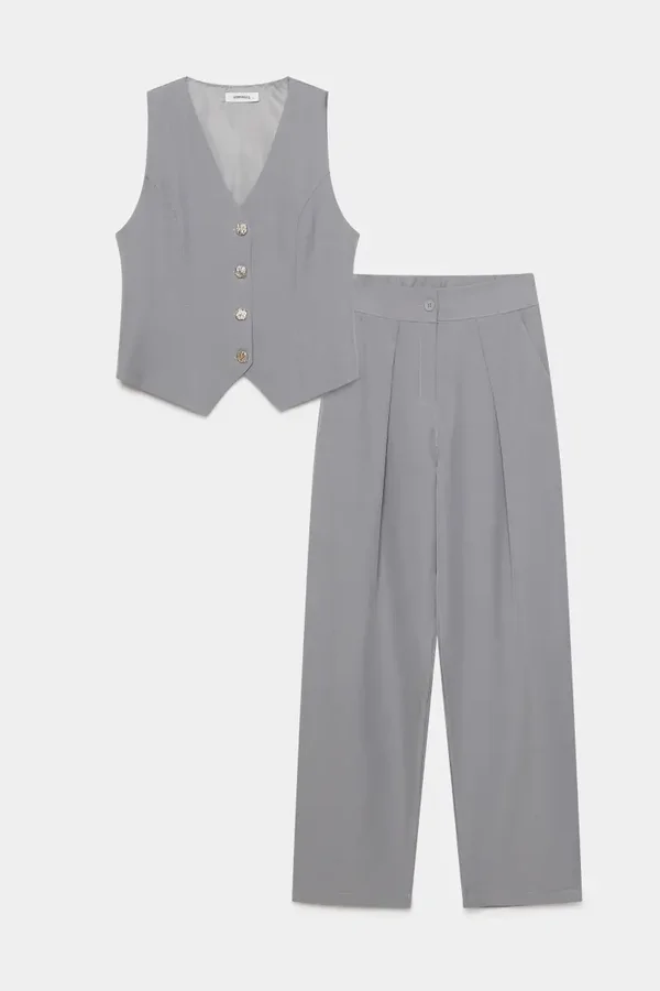 Conjunto de chaleco y pantalón. Chaleco de escote pico. Manga sisa. Cierre con botones. Pantalón de tiro alto. Cintura elastina. Cierre con cremallera y botón. Detalle de pliegues.