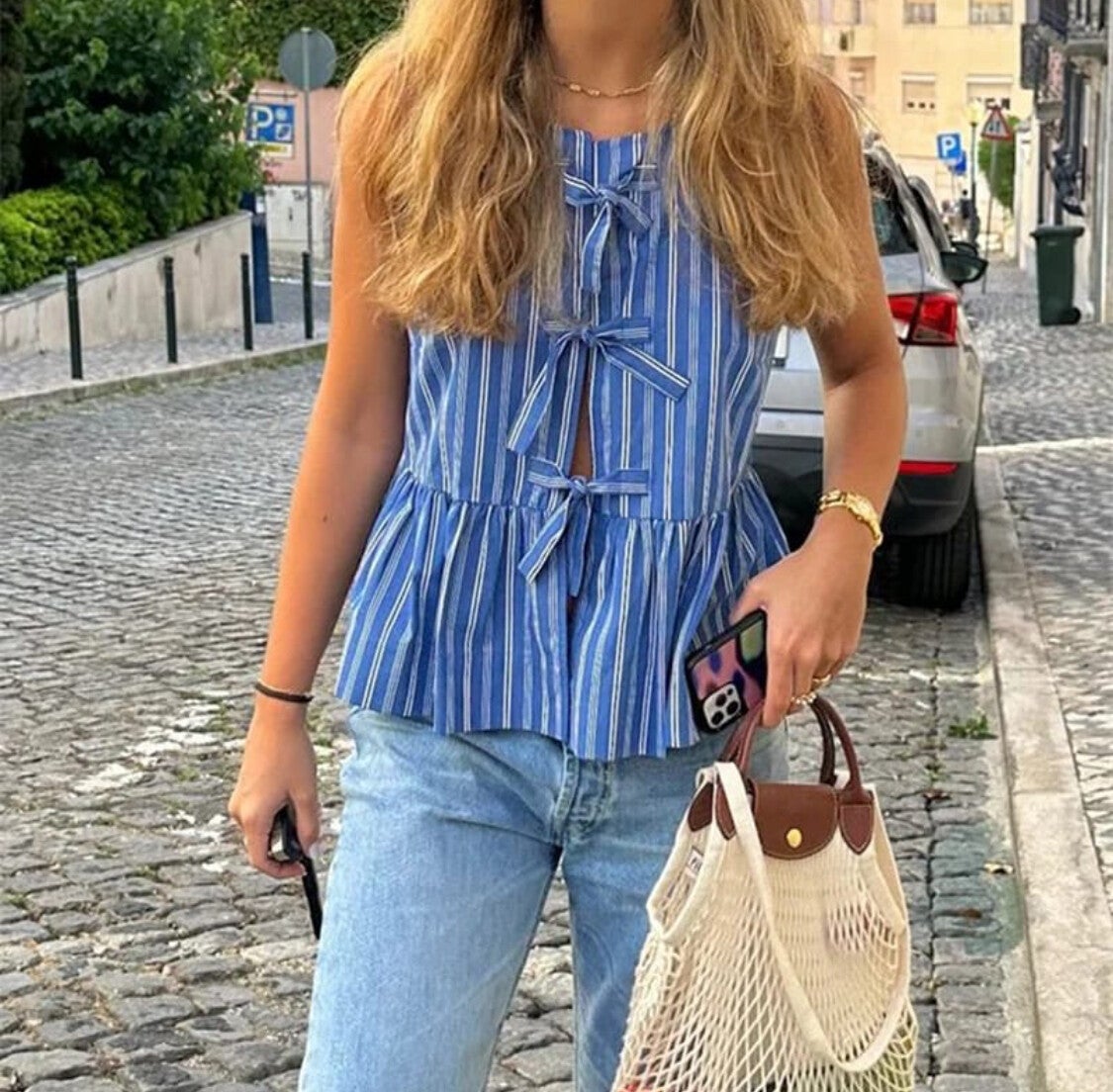 Blusa de tirante ancho en algodón 100% estampado de rayas. Cierre de lazos delanteros y detalle de volante en el talle.