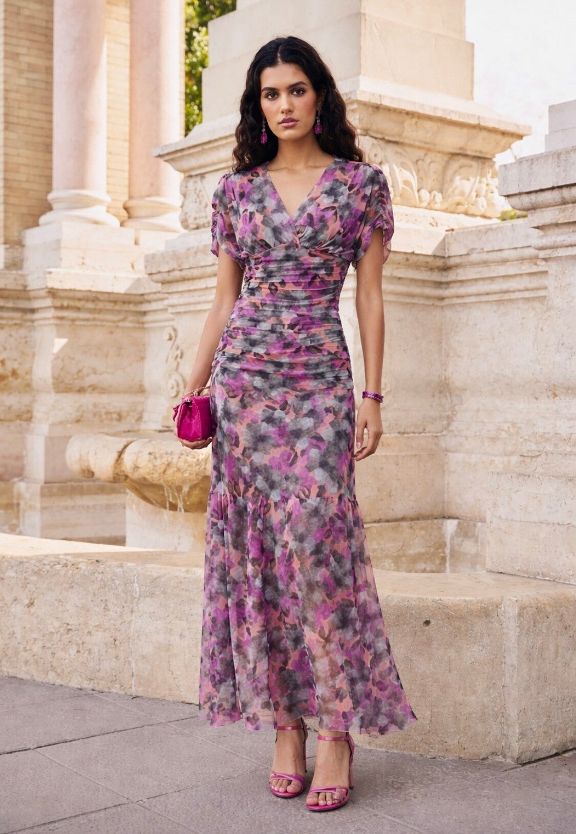 Vestido largo de gasa color buganvilla estampada flores . Detalle de frunce en mangas y cintura. Talla única. Recomendamos desde XS a M.
