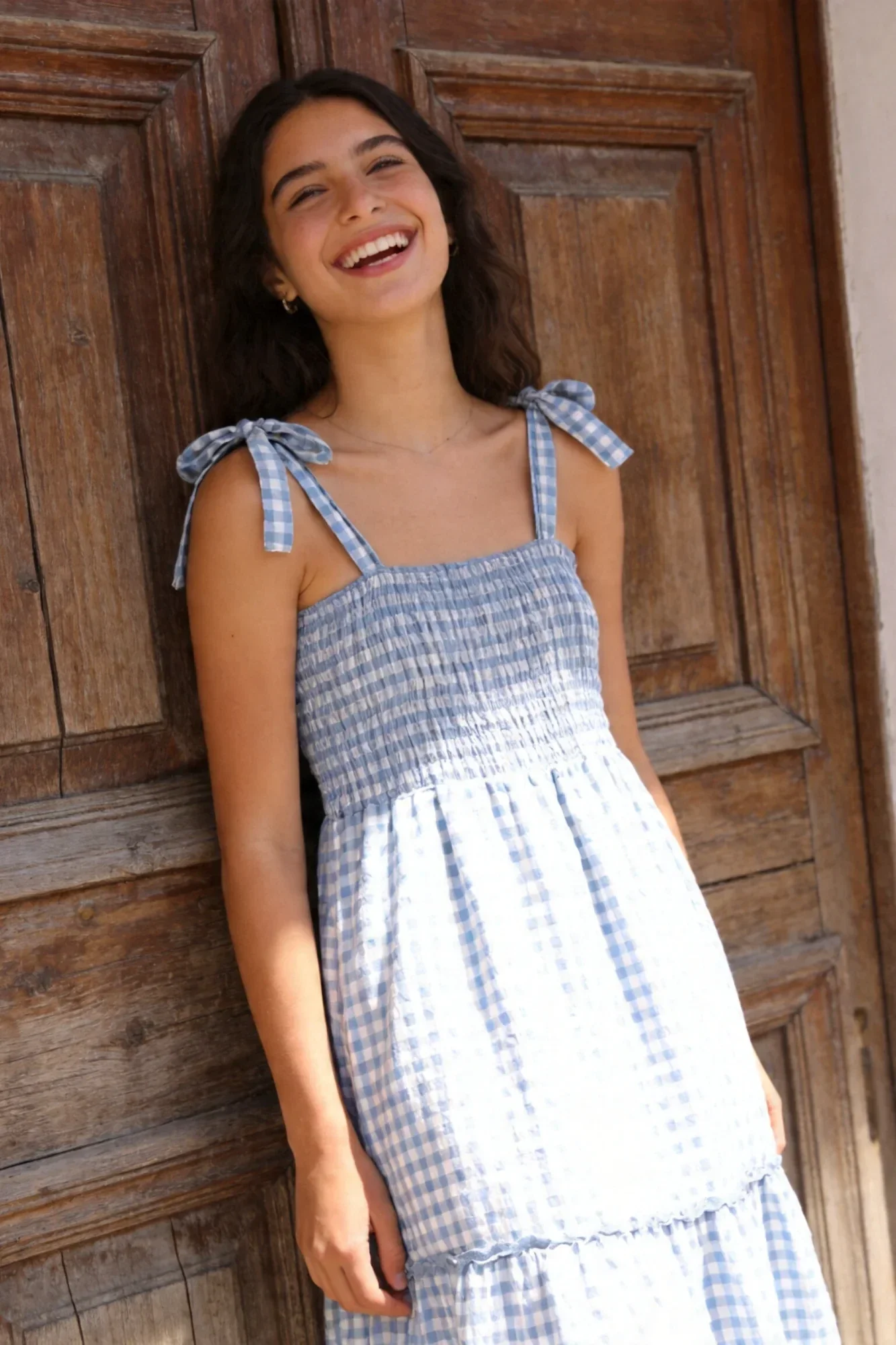 Tejido fluido. Estampado cuadros. Tirantes anchos. Pecho nido de abeja.