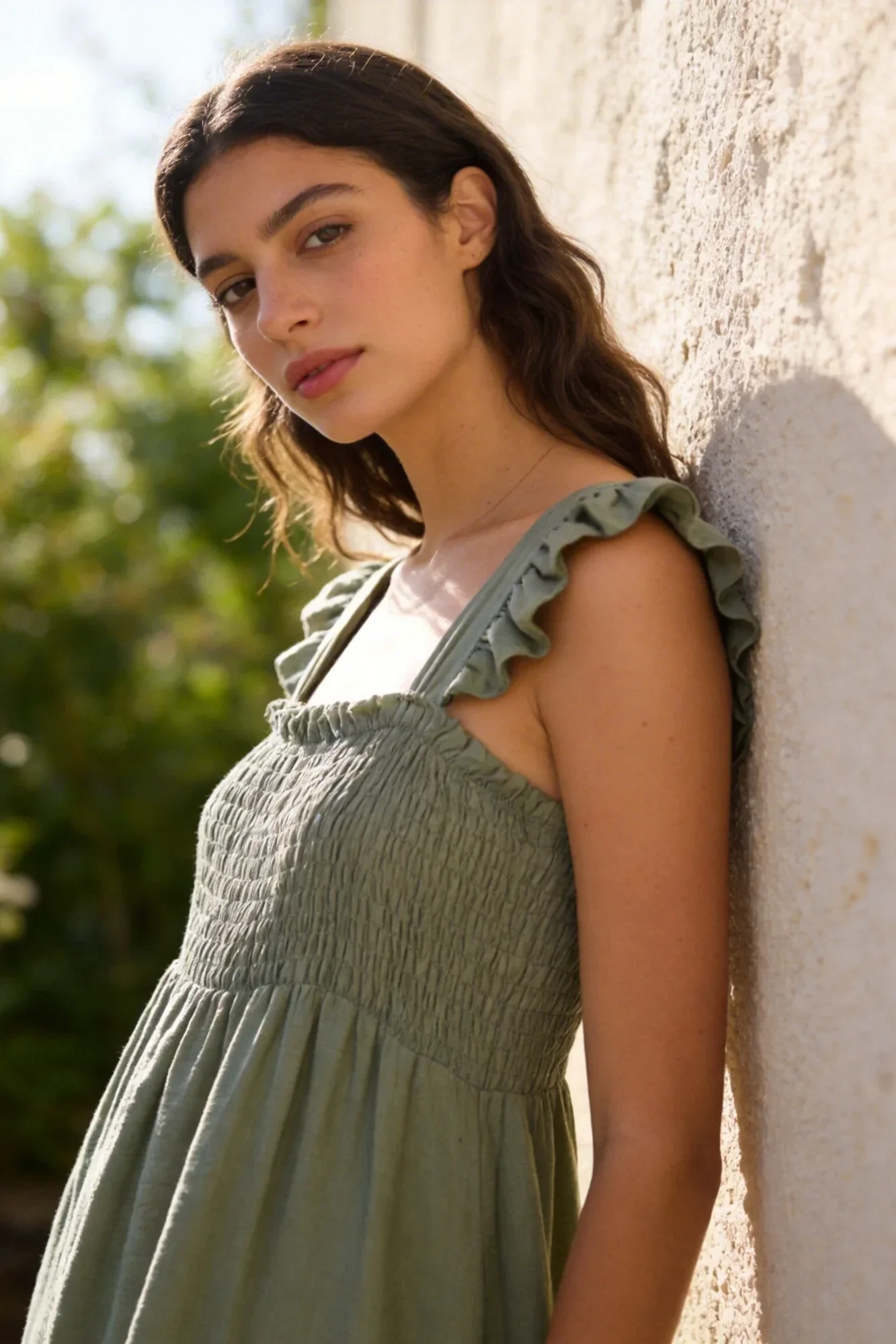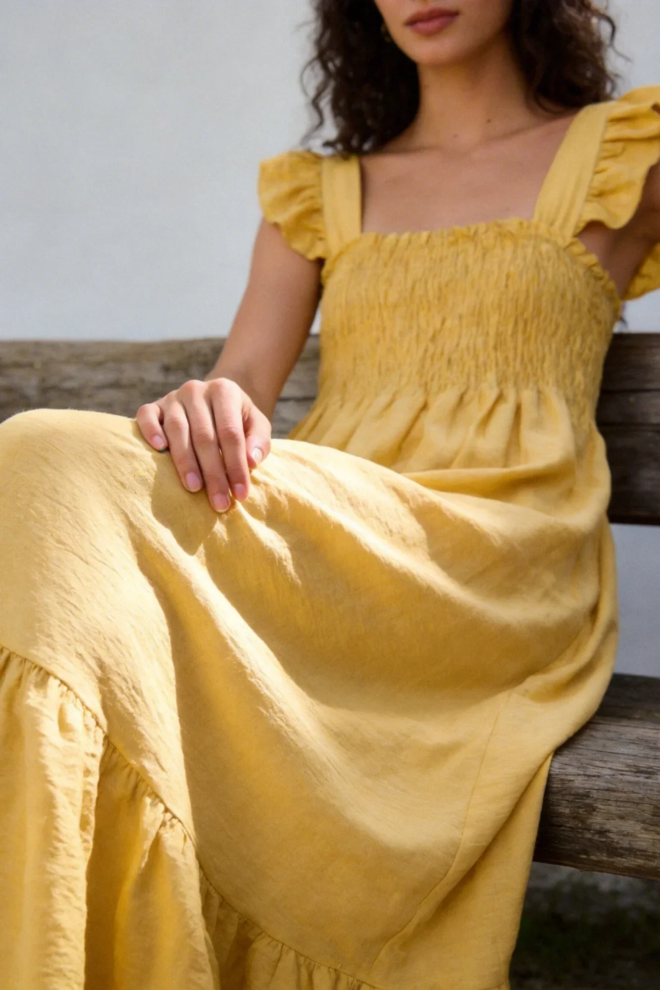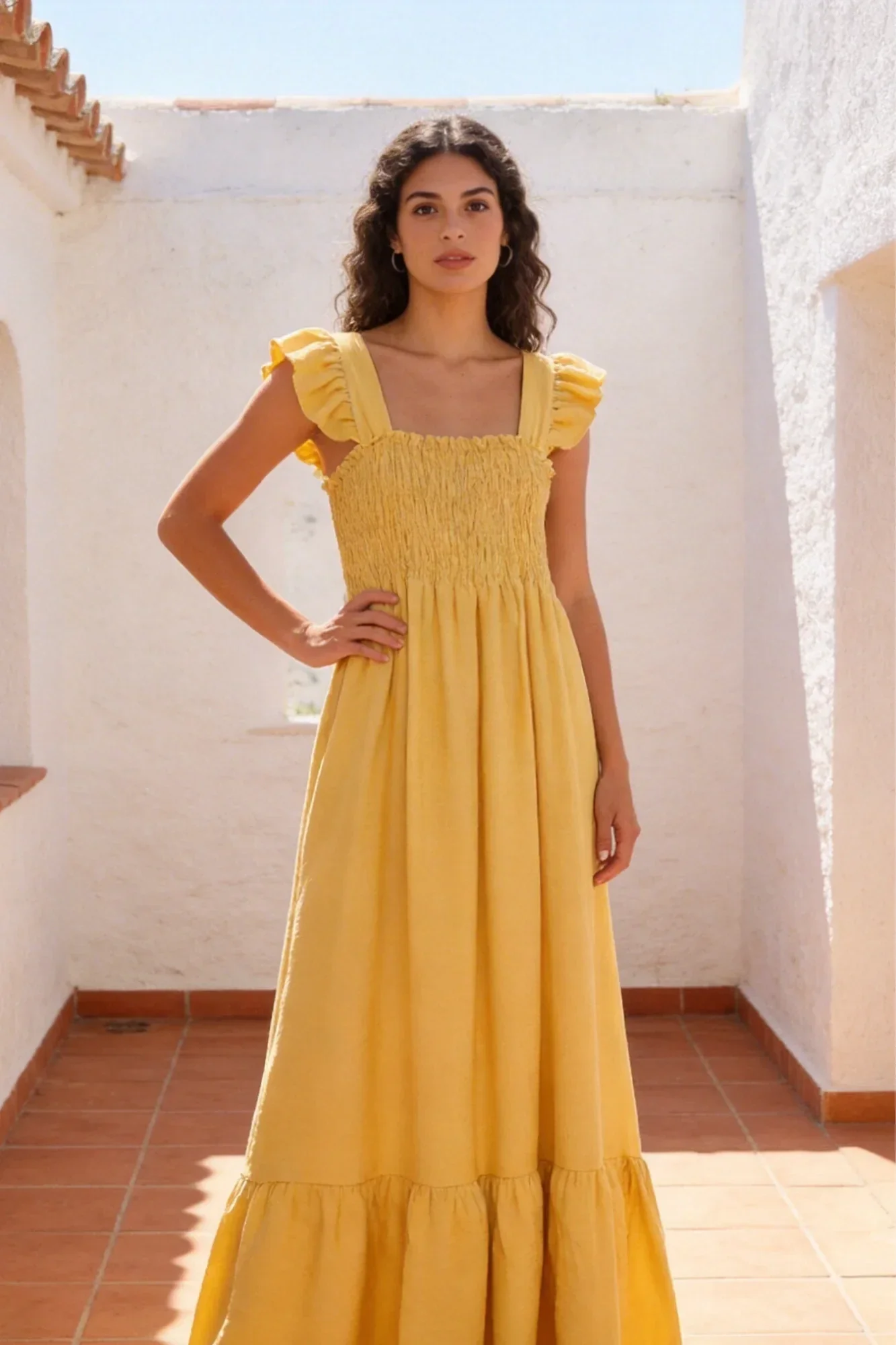 Tejido fluido. Diseño evasé. Diseño largo. Escote cuadrado.