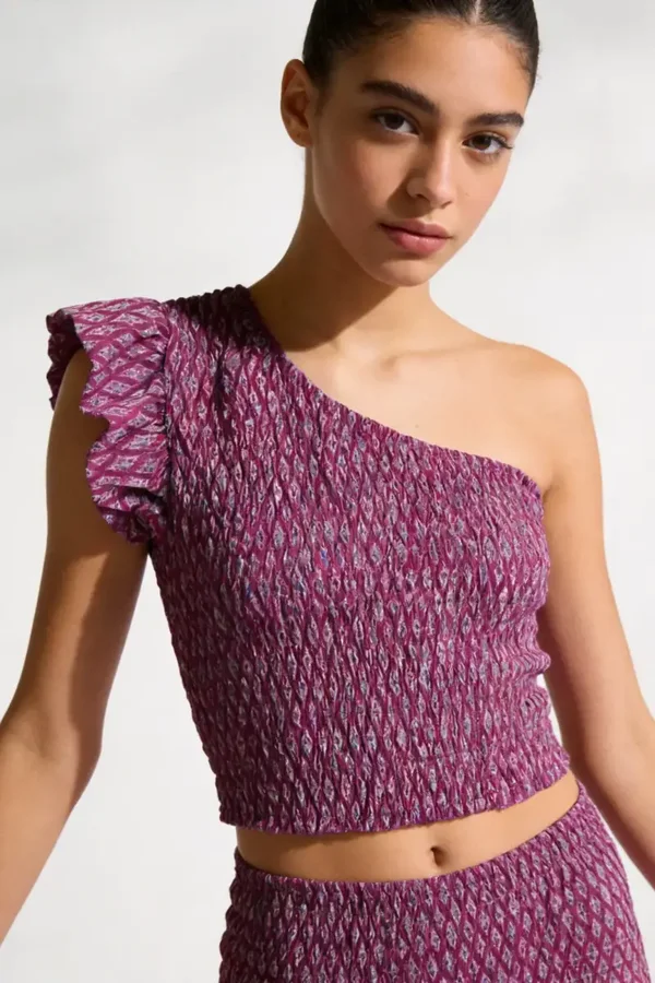 Tejido estampada. Cuerpo nido de abeja. Escote asimétrico.